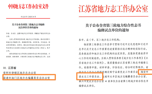 5、海门区入选第三轮修志工作全国试点,海安市入选第三轮修志工作全省试点,入选数占全省入选总数的三分之一