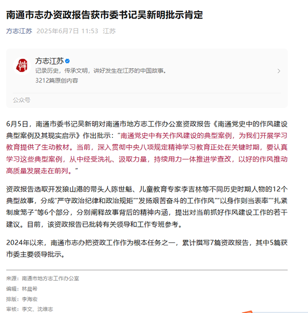 11、《南通党史中的作风建设典型案例及其现实启示》获市委主要领导批示肯定