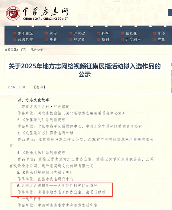 1月4日,中国地方志工作办公室公布2025年地方志网络视频征集展播活动拟入选作品名单,南通市地方志办制作的专题片《天地之大德曰生——大生纱厂时光印记系列》成功入选。本次活动共评选出44部入选作品,其中江苏省入围5部。